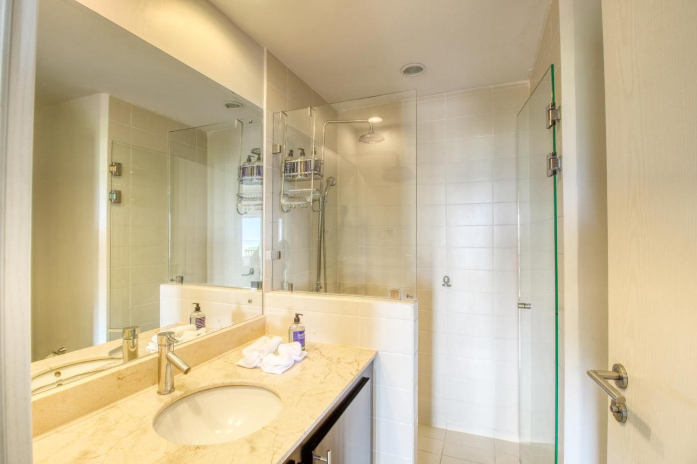 Three Bedroom Apartment. Boasting 3 bedrooms, this spacious apartment has 2 bathrooms with a walk-in shower, a seating area and terraceyou can relax. The well-equipped kitchen has a stovetop, a refrigerator, a dishwasher and kitchenware. The apartment features a washing machine, a private entrance, a tea and coffee maker, a TV with cable channels, as well as sea views. The unit offers 3 beds.